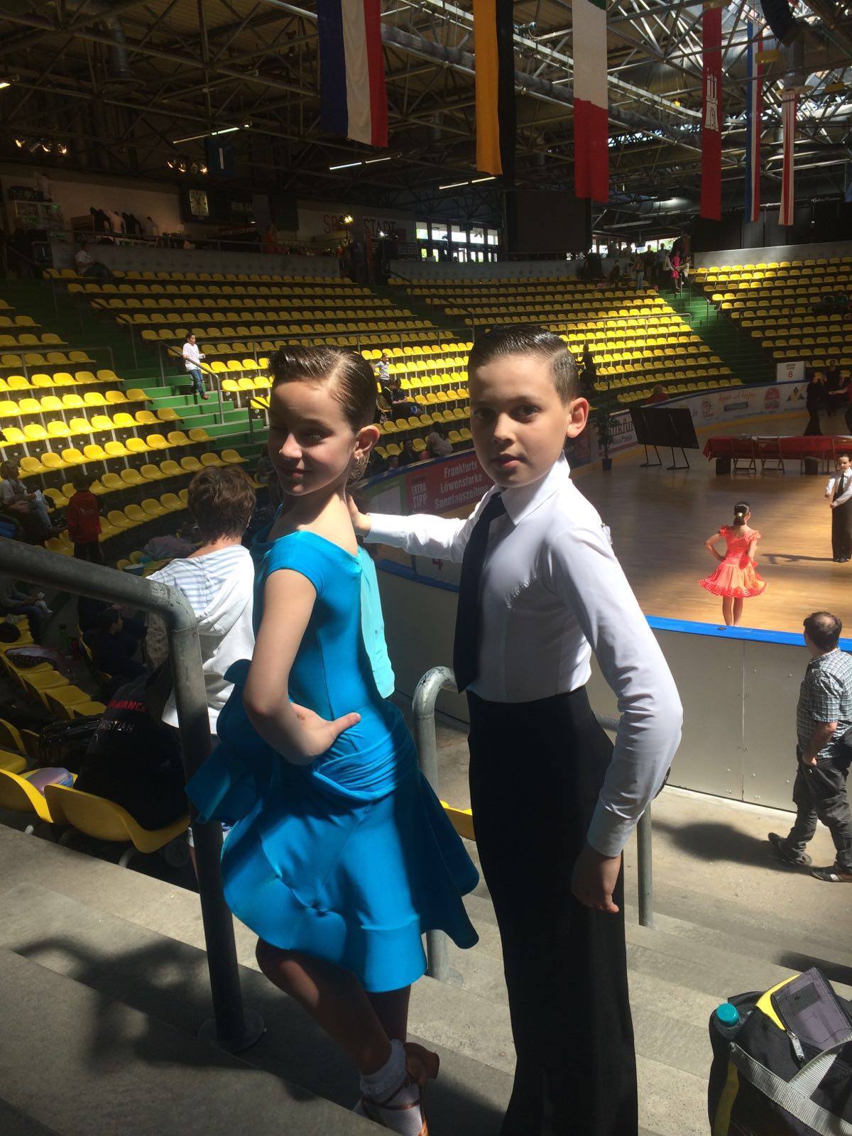 Am 06.05.2016 besuchten unsere Kids, Adrian und Sophia, zum ersten Mal „Hessen tanzt“ eines der größten Tanzturniere in Deutschland, das sich über drei Tage (Freitag bis Sonntag) hinweg zieht. Dies ist ein besonderes Turnier, denn auf der mit Parkett ausgelegten Fläche des Eissportstadions Frankfurts tanzen Paare verschiedener Turniere simultan auf bis zu 8 Flächen zu gleicher Musik. Kein Wunder, dass das ein besonderes Erlebnis für die beiden war, zum ersten Mal in so einer großen Halle zu tanzen. Die Kinder-C-Latein-Klasse, die Startklasse der beiden und gleichzeitig die höchste Startklasse für die Altersstufe der Kinder, fand am Freitag statt. In dem Startfeld von 35 Paaren waren viele starke Paare mit am Start, gegen die sich die beiden durchsetzen mussten.